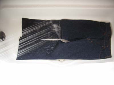 シャワーを全体的にかけ、大体ヴィンテージジーンズが水につかる程度で完了です。この時、空気を抜く為に手でジーンズを水に沈めてあげましょう。きっと貴方の手は美しいインディゴ染料で真っ青になっちゃっていますよ!