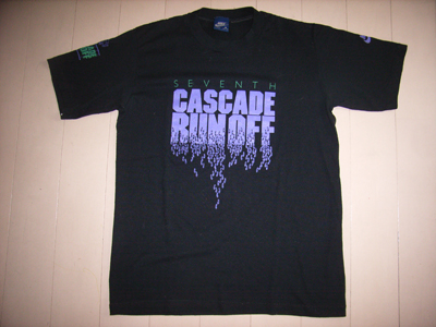 当時、一世を風靡していたインベーダーゲームを連想させるようなデザイン。 良く見ると一つ一つがスニーカーの足跡となって構成されています(笑) ロゴからCASCAD RUN OFFの大会開催が7周年であることが伺えますね!・・・ と言うことは開催は1977年からって事ですよね!